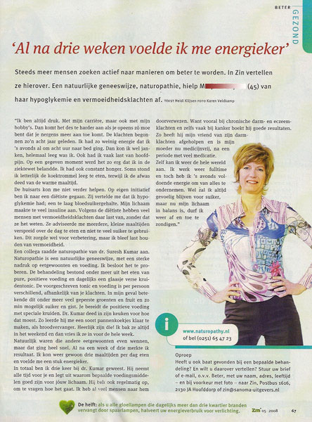 Eind 2006 vernam ik via een college over dr. Kumar. Ik heb zijn website uitvoerig gelezen en vond het erg interessant. Met de steun van mijn (ex)vriend ben ik aan dr. Kumar’s behandeling begonnen bestaande uit positieve voeding en verse kruidentonic. Ongelofelijk maar na een paar weken waren de resultaten voelbaar. Mijn hypoglykemie stabiliseerde en ik kon weer normaal 3 maaaltijden per dag eten. Met deze 3 maaltijden voel ik mij zeer comfortabel. Na 2-3 maanden kreeg ik weer meer energie en gedurende de laatste 7 maanden voel ik mij energiek en fit en heb ik het gevoel dat ik de hele wereld aan kan. Ik werk weer volledig en ’s avonds heb ik voldoende energie over voor andere dingen. Zelfs als ik af en toe laat naar bed ga, geeft dit geen problemen; mijn leven heeft haar normale routine hervat.