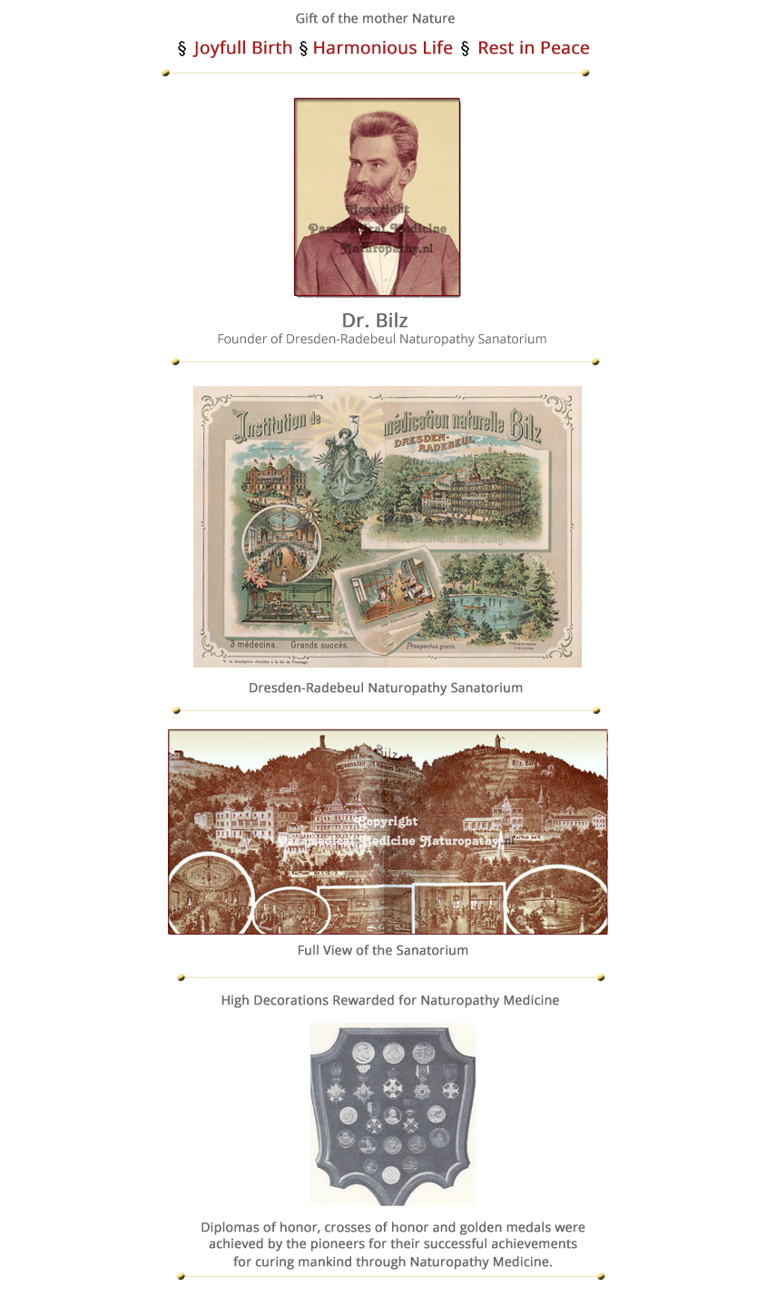 In the Dresden-Radebeul Naturopathy Sanatorium in Germany they treated many patients suffering from acute, chronic and fatal diseases successfully through Naturopathy Medicine. The Dresden Sanatorium publication Practical Naturopathy, which consisted of 1700-2200 pages (part 1 and part 2) was printed and circulated more than 100 years ago, and then republished by Dr. Ootmar MD (in 1922 - Netherlands). More than one million copies were sold in the 19th century and were crowned with 25 Golden Medals, Crosses of Honor and Certificates of Honor. This book was translated into different languages like: Danish, Swedish, Russian, Polish, English, Dutch, French, Spanish, Portuguese, Italian and the Bohemian and Hungarian languages.